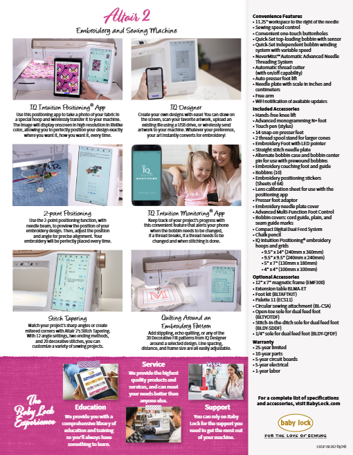 As an authorized Babylock retailer, we provide expert guidance to help you get the most from your Altair2. Visit us for a hands-on demonstration and discover why quilters trust Babylock.