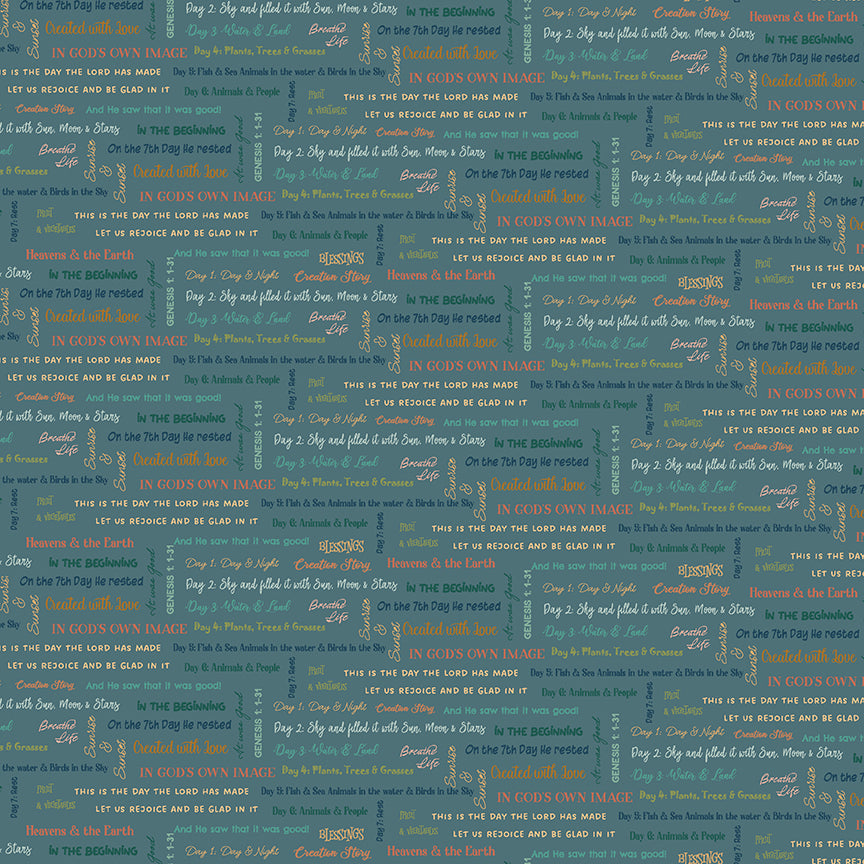 Created with Love by Jennifer Long of Sew A Story for Riley Blake Designs is great for quilting, apparel and home decor. This print features text related to the creation of the earth.