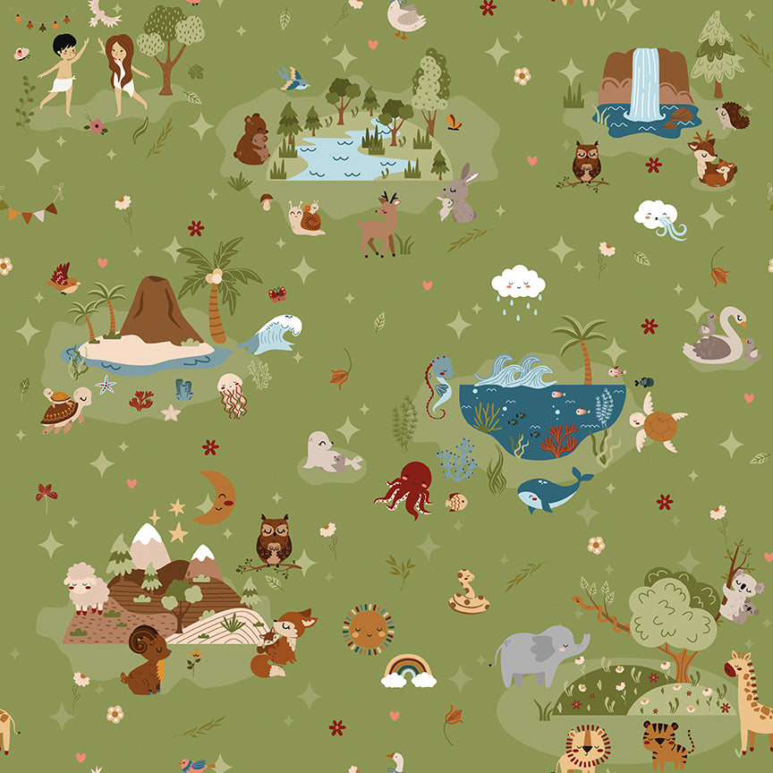 Created with Love by Jennifer Long of Sew A Story for Riley Blake Designs is great for quilting, apparel and home decor. This print features a myriad of animals, flowers, leaves, rainbows, and more.